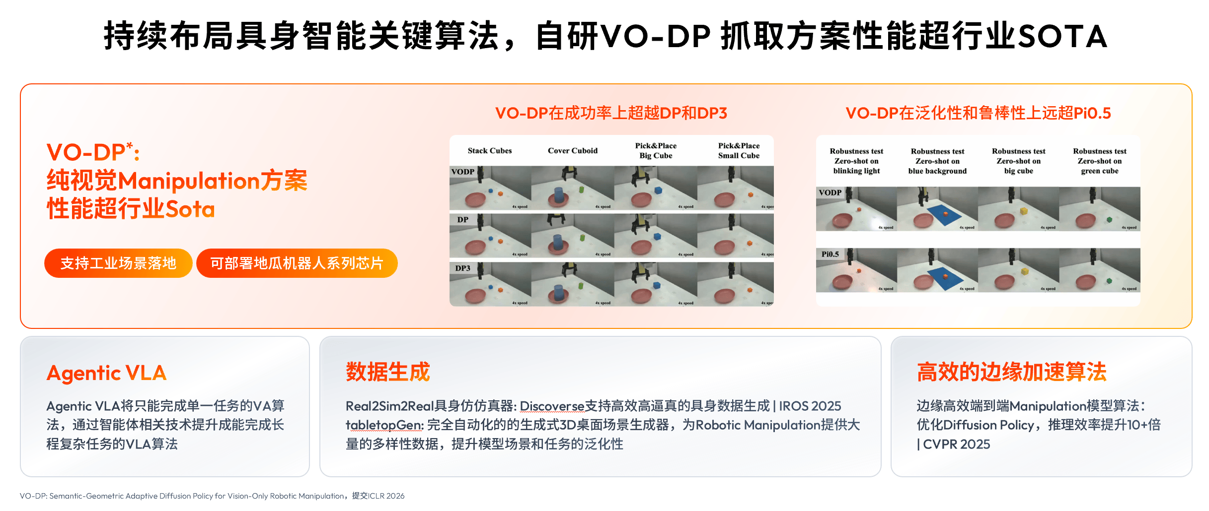 地瓜机械人正在前沿算法范畴亦不竭立异,取端侧智能计较平台软硬连系,帮帮客户和开辟者实现先辈算法正在端侧的高效摆设。例如,地瓜机械人自研的双目算法SOTA目标行业领先,以精度媲美激光雷达的双目Depth、避障机能达到智能驾驶级此外双目OCC、业界首个多双目全景Occupancy方案高阶段Omni-OCC方案,持续赋能机械人客户产物落地。地瓜机械人持续结构具身智能环节算法,自研的VO-DP纯视觉Manipulation抓取方案机能超行业SOTA,成功率超越DP和DP3、泛化性和鲁棒性远超Pi0。5,达到工业场景的使用要求。