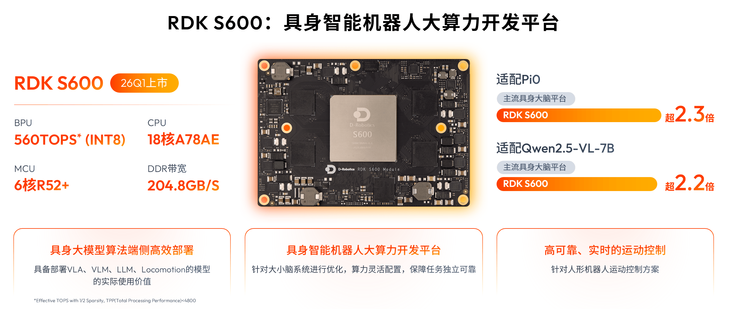 此次前瞻表态的S600做为地瓜机械人的旗舰级具身智能机械算力开辟平台,具有560 TOPS*(INT8) 算力,采用高效矫捷的大小脑架构设想并进行了深度优化。其大脑设置装备摆设18核A78AE CPU和全新BPU Nash,可支撑VLA、VLM、LLM、Locomotion多种具身大模子算法端侧高效摆设,特别是正在适配Pi0、Qwen2。5-VL-7B时,机能别离超越支流具身大脑平台2。3倍和2。2倍,满脚复杂决策需求;小脑设置装备摆设6核R52+ MCU,专为人形机械人优化,具备高靠得住、及时的活动节制能力。